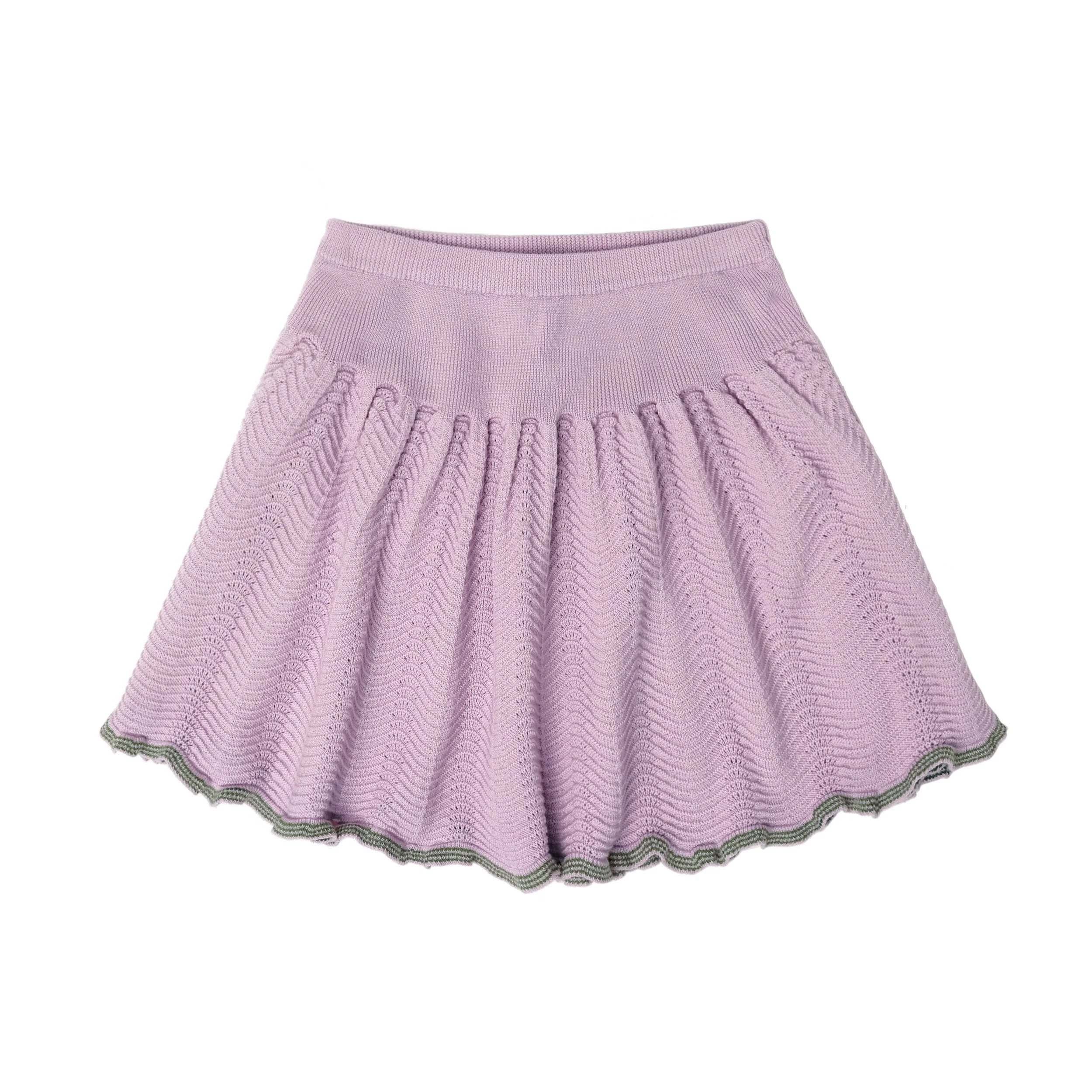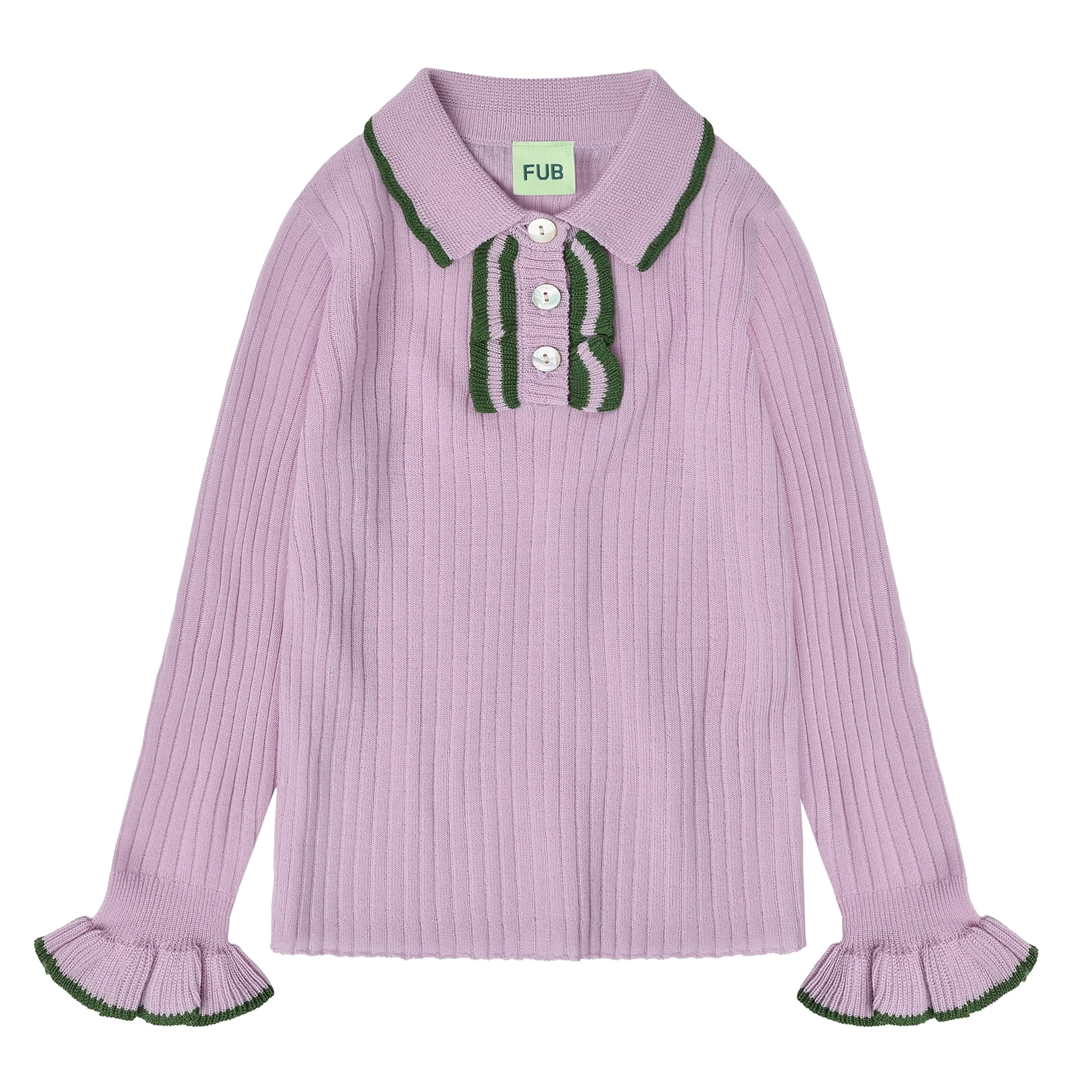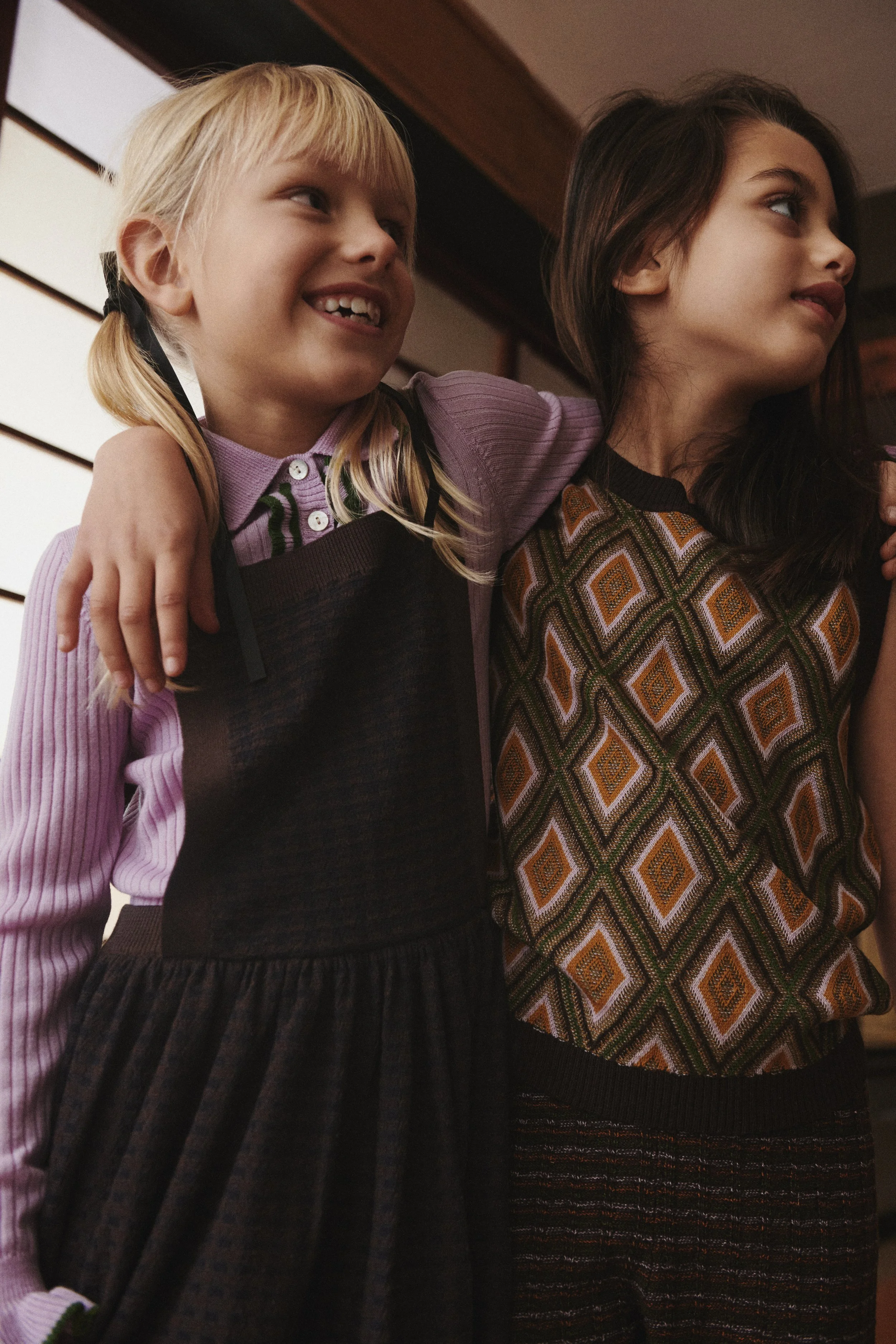 Made from pure merino wool, this knee-length dress features a small, laced shirt collar, a placket with pearl shell buttons, and long sleeves. The collar and placket have a contrast colour edge. The top of the dress is knitted in a classic rib structure, while the wide, flared skirt is knitted in a soft single jersey. The merino wool is BLUESIGN® and RWS certified, free from harmful chemicals, and sourced from non-mulesed sheep.